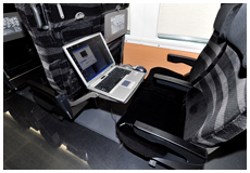 全席にモバイル用コンセントおよびノートパソコンが置ける背面大型テーブルを装備。WiMAXを用いたブロードバンド環境も整っている。