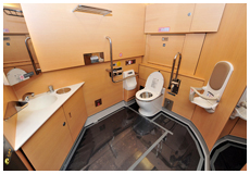 グリーン車および普通車には車椅子を固定できる1人掛けのシートを設置。5号車のデッキには電動車椅子対応の大型トイレが設置されている。