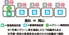 3・5・7両編成の1号車の運転台後ろはパノラマシート(グリーン車)で、高松行きの下り列車では瀬戸大橋を渡る時の前面展望が楽しめる。