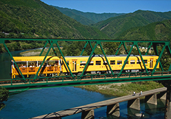 1984(昭和59)年7月に国鉄初の貨車を改造したトロッコ列車として登場したのが、予土線の「清流しまんと号」だ。登場から29年目を迎えた2013年8月で運転を終了し、デザインをリニューアルした「しまんトロッコ」として同年10月5日に新たなデビューを飾った。多くの観光列車を手がける水戸岡鋭治氏による新デザインは、貨車を改造したトロッコ車両の素朴さや楽しさを、山吹色のボディーで表現するというものだ。