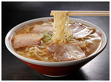 麺が太く平たく、縮れているのが特徴の「平打ち熟成多加水麺」を使用したラーメン。市内に100軒以上ある店舗でコシのある独特な食感を味わえる。