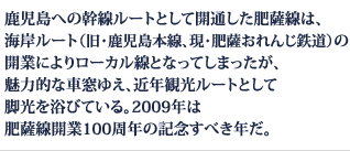 今年開業100周年を迎えた100年レイル「肥薩線」は、3つの個性的な区間からなるホットなローカル線だ。平成21年4月からは豊肥本線で「SLあそBOY」として活躍し、2