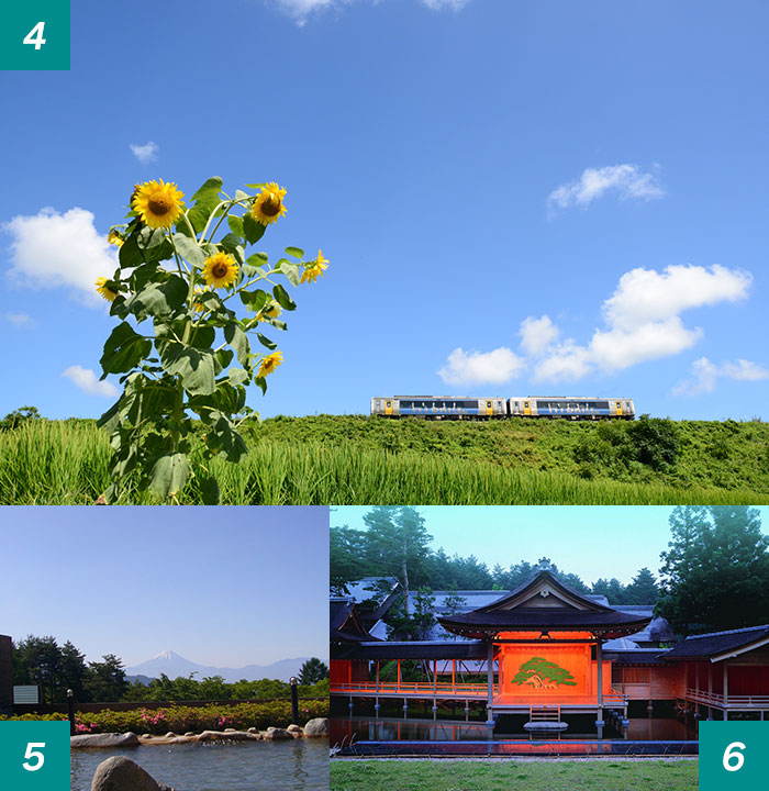 小淵沢駅の2駅手前、甲斐大泉駅で途中下車したら、「甲斐大泉温泉パノラマの湯」で立ち寄り入浴。北は八ヶ岳、西は南アルプス、東は瑞牆(みずがき)山に囲まれた同湯の自慢は、なんといっても露天風呂からの眺めだ。広々とした露天風呂の正面には富士山がドーン! 日本一の霊峰からパワーをもらいつつ、温泉でリラックスという贅沢なひとときを過ごそう。