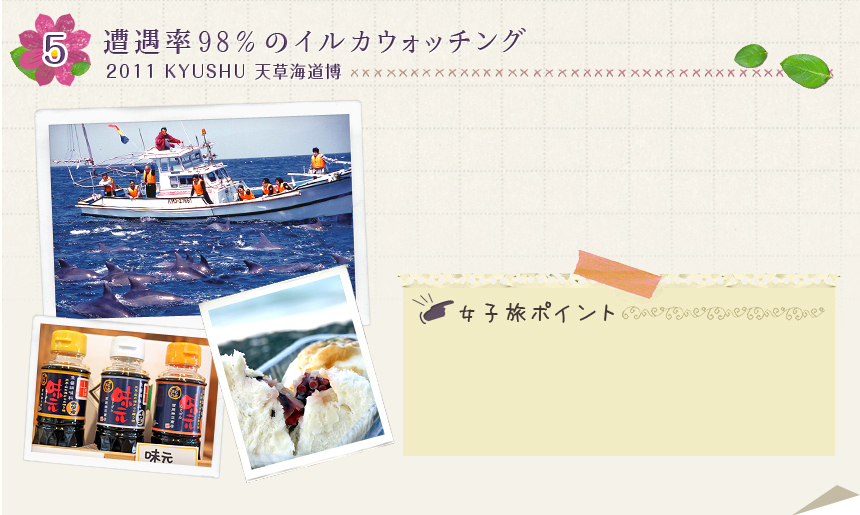 天草はめぐって楽しいポイントがたくさん。現在開催中の「2011 KYUSHU 天草海道博」では、島の魅力を5大海道、100の海道にわけて紹介。例えば、フィッシャーマンズ大海道では、「イルカ海道」として遭遇率98%のイルカウォッチングや、「タコ海道」として名産のタコのオブジェやタコ料理が楽しめるコースを提案。天草が全国に自信をもって紹介できるものだけを集めた天草ブランドの商品「天草謹製」も見逃せません。