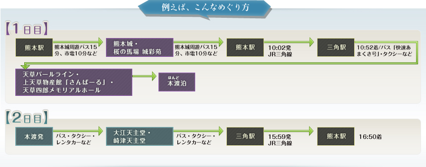 三角駅のある宇土半島から天草上島まで、天草五橋で結ばれた国道「天草パールライン」は、真っ青な海に点々と大小の島が浮かぶ最高のドライブコース。上天草物産館さんぱーるで見つけたカステラを餅で巻いたお菓子「あか巻」や、サツマイモと餅米で作る「こっぱもち」など、天草伝統スイーツはお土産にぴったり。天草・島原の乱の総大将だった美少年、天草四郎時貞をテーマにした天草四郎メモリアルホールも必見です。