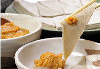 岩手で蕎麦といえば、わんこそば。掛け声とともに、朱塗りの椀に一口ずつ盛った蕎麦をリズミカルに食べます。「ゆでたてのおそばをお腹いっぱい食べて」という“おもてなし”の気持ちの表れとか。この蕎麦を三角に切って豆腐や大根と茹でて食べるのが「そばかっけ」。ハレの日の行事食で、大人はニンニク味噌、子どもは甘くコクのあるクルミ味噌などをつけていただくそうです。