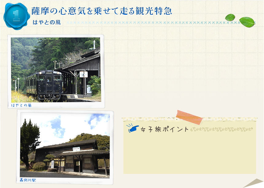 車窓からの景色もパワフル☆ 錦江湾の水際を走り、鹿児島のシンボル・桜島を眺めたり、明治36年(1903)に開業した嘉例川(かれいがわ)駅舎のレトロな雰囲気を楽しんだり。