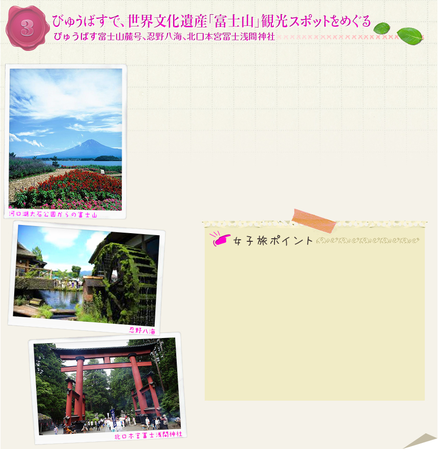 今年、ついに富士山が「信仰の対象と芸術の源泉」として世界文化遺産に登録されました。その魅力をたっぷりと味わえるのが「びゅうばす富士山麓号」。富士山の構成資産である山麓の名所観光や由緒ある神社の参拝に、昼食がついた周遊観光バスです。現地発着のコースのほか、首都圏各駅からの往復JRきっぷと宿泊を組み合わせたセットコースもあり、おトクかつ便利に富士山周辺を観光できます。