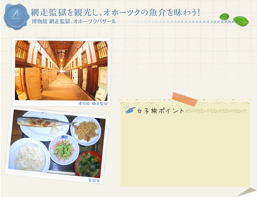 開館時間:9:00~17:00(4月~10月は8:00~18:00)。無休。入館料:大人1050円、大学・高校生730円、小・中学生520円。監獄食堂=4月~10月と2月~3月の10:00~15:30に提供。交通:網走駅からバス約7分の「網走監獄博物館」下車すぐ。TEL.0152-45-2411