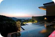 老舗旅館「御宿東鳳(とうほう)」は高台から眺められる美しい夜景が自慢。露天風呂「棚雲の湯」では3段に連なる浴槽から異なる景色を楽しんで。