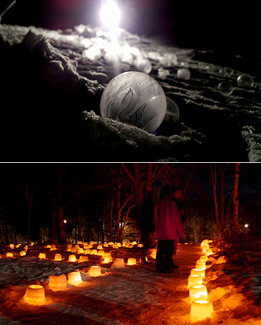 川湯温泉の冬は、雪灯りの美しさに息を呑む。点々と続くロウソクの灯りに誘われ小径を行けば、現代アーティストが手がけた作品と雪灯りがコラボするスノーキャンドルの森。また、足湯もある川湯園地では、氷点下10度以下となり気象条件がそろえば、湯の川から立ち昇る水蒸気が細氷に変わるダイヤモンドダストが見られることも。光が当たり、きらめく様は神秘的。