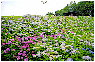 四国で唯一の国営公園である国営讃岐まんのう公園。198haの広大な敷地にはキャンプ場や自然生態園などもあり、一年を通じて様々な体験が可能。竜頭の里にある飛竜池を眺める斜面には、ガクアジサイやヤマアジサイなど色とりどりのアジサイが40品種2万株植えられている。池の周囲にはプロムナードが巡らしてあるため、アジサイを見ながらの水辺散策が楽しめる。