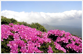国立公園の霧島連山に囲まれた標高1200m にあるえびの高原。硫黄の匂いが漂う溶岩地帯を背景に四季折々の美しい景観を見せる。ミヤマキリシマは九州の高山に自生するツツジの一種で、つつじヶ丘には約3万本が咲きそろう。他のツツジに比べて花の密度が濃く、葉や地面が見える隙間が少ないため、群生地は濃いピンク色一色に。他の植物が根付かない岩場にも、たくましく花を開く姿からは、野生ならではの美しさが感じられる。