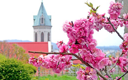 坂の町、元町で教会をバックに花が咲く。函館の桜は早い年で4月22日頃には開花するという