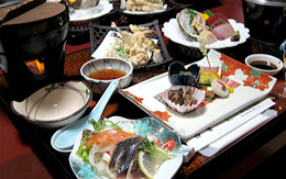 「八食センター」で目にとまる豊富な海の幸。ここは食事処も充実のおすすめスポットだ