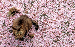 浅野川沿いに歩くと散り桜のカーペットに猫がひょっこり乗っていた。桜と猫はよく似合う