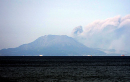 指宿枕崎線の車窓に望む錦江湾越しの桜島。ふいに噴火を始めた光景に思わず息を呑む