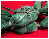 新潟名物の「笹団子」は、スゲの紐をほどき、バナナの皮のように笹の葉をむいていただく