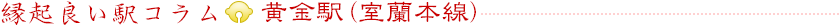 さて次なる縁起良い駅、黄金(こがね)駅は室蘭本線にある。特急列車は停車しない駅なので最寄の特急停車駅、東室蘭で普通列車に乗り換えて向かう。本プランでは函館14時ちょうど発の特急「北斗11号」としたが、一つ前の特急で東室蘭へ行き、名物のカレーラーメンをすするのもあり。