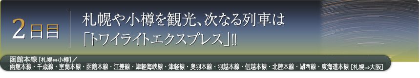 ![2日目札幌や小樽を観光、次なる列車は「トワイライトエクスプレス」!!|函館本線[札幌⇔小樽]/函館本線・千歳線・室蘭本線・函館本線・江差線・津軽海峡線・津軽線・奥羽本線・羽越本線・信越本線・北陸本線・湖西線・東海道本線[札幌⇒大阪]](images/ttl_b.jpg)