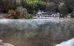 温泉も湧き出す金鱗湖は水温が高く、外気との温度差によっては幻想的な霧が立ち上ることも