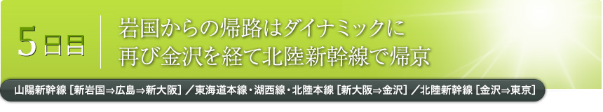 ![5日目|岩国からの帰路はダイナミックに再び金沢を経て北陸新幹線で帰京山陽新幹線[新岩国⇒広島⇒新大阪]/東海道本線・湖西線・北陸本線[新大阪⇒金沢]/北陸新幹線[金沢⇒東京]](images/ttl_e.jpg)