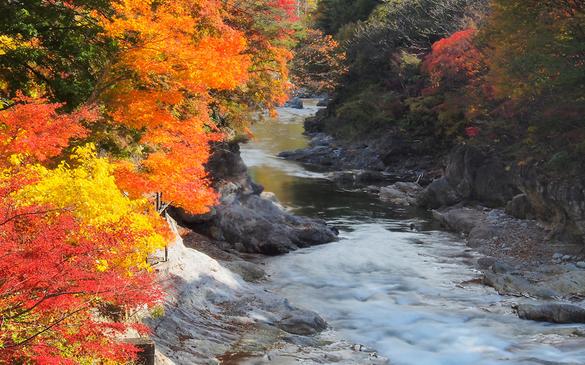 腹ごしらえが完了したら、諏訪峡へ向かおう。いよいよ渓谷沿いの遊歩道を歩き出すと、清冽な利根川や紅葉橋、清流公園などの光景が清々しい。笹笛橋を過ぎると、より峡谷の趣が濃くなり、紅葉の木々の合間に珠簾(たまだれ)の滝、竜ヶ瀬、坊岩、夫婦岩などの名勝が次々と現れる。