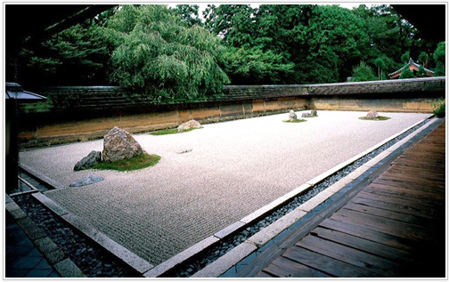 龍安寺 方丈南側の庭園が石庭。「虎の子渡しの庭」「七五三の庭」とも呼ばれ、見る人によって様々な解釈ができる。TEL.075-463-2216。500円。8:00~17:00(12~2月は8:30~16:30)