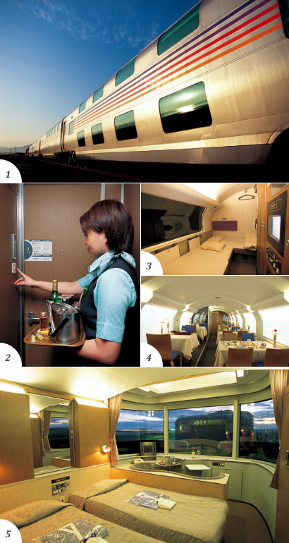 オール2階建て、オール2人用A寝台個室、ダイニングカーにラウンジカーとまさに「走るホテル」の称号にふさわしいブルートレイン。快適な個室で一息ついたら、ラウンジカーなどの共用スペースで車窓を満喫してください。特に、下り列車なら、夜明けを迎え、北海道駒ケ岳を背に内浦湾の水平線に漁火が浮かぶ車窓風景は必見です。また、列車と機関車の向きを把握すれば、眺望が倍楽しめます。たとえば、カシオペアスイート展望室を楽しむなら下り列車をチョイス。上り列車なら、ラウンジカーでの眺望をおすすめします。