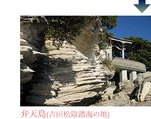 松陰らが潜んだという柿崎の弁天島をめざして、まどが浜海遊公園の遊歩道を海沿いに歩く。真っ青な湾を行き来する船の向こうに半島の丘の緑がゆるやかな連なりを見せている。地元の子供たちが描いた町の歴史を描いたレリーフを眺めながら「松陰の小道」をのんびり行くと、その終点に弁天島があった。急な階段を上り頂上に至ると、背後の岩場を刳り貫くように「下田龍神宮」と書かれた古いお堂が建っていた。ちょうどその下あたりに、松陰らが身を隠した祠があるのだろう。身を乗り出して眺めると、海の青に岩場の白さがあまりにもまぶしくて、160年前、ここから二人の男が決死の思いで船を出したとはとても想像することができなかった。下田の平滑の獄に入れられた松陰はその後、江戸伝馬町の牢屋敷へ移され、さらに故郷の萩へ送られ野山獄へ入れられた。出獄を許された後は、杉家に幽閉の処分となり、久坂玄瑞や高杉晋作、伊藤博文らを育てた松下村塾を開塾するも、安政5年(1858)、幕府が無勅許で日米修好通商条約を締結したことに激怒し、老中首座であった間部詮勝の暗殺を計画。その翌年、安政の大獄に連座し江戸で斬首刑に処された。