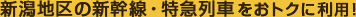 駅前タクシー乗り場のタクシーを利用して、周辺の観光地をおトクな価格で気軽にまわれるタクシー観光プラン「駅から観タクン」。新潟・庄内エリアは、燕三条・長岡・浦佐・小出・十日町・鶴岡の各駅発プランがあります。