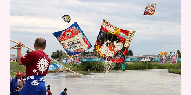 中ノ口川を挟んで東西軍が24畳サイズの大凧を飛ばし合い、綱を絡めて引き合う「白根(しろね)大凧合戦」。相手の綱を切ったほうが勝ち!