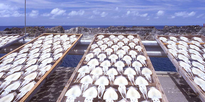 佐渡では年間を通してイカが獲れるが、6月頃から獲れる真イカが一番おいしいと評判! 一夜干しや細く切ったイカそうめんは絶品だ。アワビやサザエも夏が旬。