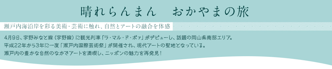 JRグループでは、岡山県と共同で大型観光キャンペーン「晴れの国おかやまデスティネーションキャンペーン(DC)」を開催します。瀬戸内海の島々や街を特別な空間に彩る「アート」、晴れの国の美しい情景「ビュー」、岡山の恵みと郷土に愛され育てられてきた「テイスト」、大自然が体と心を癒す「リラックス」、岡山の歴史が造り上げてきた「ヒストリー」という5つのテーマで様々なイベントを展開。岡山を旅すれば、心晴れ晴れ!