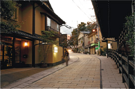 夕闇に溶けゆく「いでゆ坂」の風景。坂の両脇に旅館が連なる