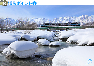 大糸線といえば、美しき北アルプスに囲まれた風光明媚(めいび)な路線。やはりアルプスは雪化粧をした冬がいい。さらには青空にそびえ立つ雄姿を撮影したいものだ。ここでは、北アルプスを背景に松川の流れとともに撮影できる有名ポイントを紹介。岩場に雪が積もってできた雪坊主をモチーフにして構図をとりたい。ただ、雪が積もっている時は、くれぐれも足元に注意してほしい。積もった雪の下が川だったなんてこともあり危険だ。この時期なかなか快晴とはいかないが、好天を狙って出かけてほしい。