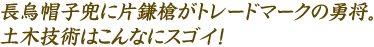 武田信玄の家臣だった真田幸隆の孫。父は昌幸。実名は「信繁」だが物語上では天才軍師「幸村」として広く知られる。関ヶ原の戦い時には、兄・信之と袂を分かち西軍(豊臣方)につき上田城で徳川秀忠と抗戦。大坂夏の陣では家康の本陣に切り込み大活躍を遂げた。