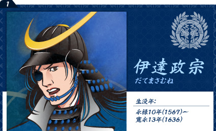 父・輝宗の死後、奥州を次々と制覇し江戸にもその名を轟かした。秀吉の小田原攻めに白衣の死装束で遅参しながらも切腹を免れたことは有名。関ヶ原の戦いでは東軍(徳川方)に加勢し、戦後は外様大名として栄えた。南蛮貿易のため支倉常長をスペインに派遣。