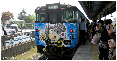 「はまるーぷバス」で米子空港から境港まで行けるが、水木ファンなら乗りたいのが境線を走る鬼太郎列車。現在、「鬼太郎」「ねこ娘」など4種の列車が運行中。米子駅=ねずみ男駅など各駅に妖怪の愛称が付いているのも楽しい。