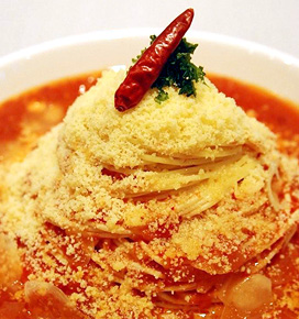 さて、お次は群馬県の高崎に移動してランチタイム。高崎は小麦の生産量が多く、かつ新しいもの好きという気風からか、うどんではなくパスタが名物料理に。駅東口から徒歩10分の「スパゲッティー専科はらっぱ本店」で、トマトの酸味と甘さ、そしてニンニクが効いた「赤唐辛子とにんにくのトマトソース」(生パスタで1113円)を平らげる。「ウチのニンニクは青森県天間林産を使っており、匂いが気にならないと評判なんです」とは社長・岩田さんの弁だ。