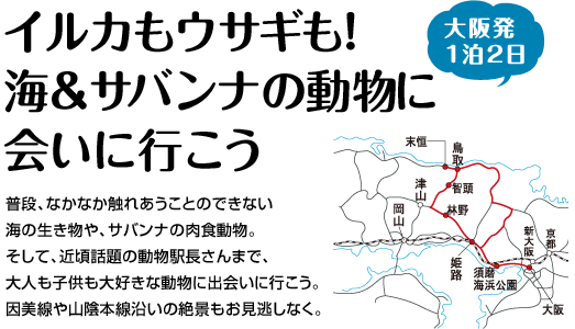 再び山陽本線で大阪湾から播磨灘へと移動して姫路駅へ。「姫路セントラルパーク」のウォーキングサファリでは、キリンやゾウへの餌やりが可能! サバンナテラスという高台に上がり、キリンと同じ目線に立てるのは、子供にとって貴重な体験だ。12月23日からは冬季限定アイスパークがオープンするので、冬ならではのスポーツで体を動かそう。駅に戻り、姫路おでんを食べたら姫新(きしん)線に乗り「湯郷(ゆのごう)温泉かつらぎ」へ。肩こりにいいとされる美作(みまさか)温泉で疲れを癒す。カフェは夜12時まで営業なので、季節限定パフェなど人気メニューを堪能しよう。