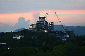 最後は、宮本武蔵の妖怪退治伝説が残る姫路城を一望できる、「イーグレひめじ」の展望ビアガーデンへ。180度の展望がきくうえ、正面にはライトアップされた改修中の大天守を望めるとあれば、ビールの旨さも増すというもの。8月までは、まだ大天守も半分ほど見られるという。大天守との名残を惜しみつつ、満腹のムシャムシャ修業を終える。