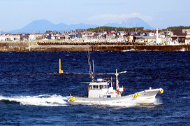 大間の海を行く漁船。海岸線に沿うように家々が並ぶ大間は、マグロをはじめ、イカやウニ、昆布など海の幸に恵まれている。北海道も思った以上に近く、バックの山並みは道南の恵山(えさん)だ