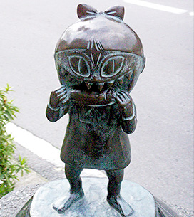 こちらは『ゲゲゲの鬼太郎』に登場する「ねこ娘」のブロンズ像。境港は港町だけに魚も新鮮なのだろう。なんともいえない表情で魚を食べている。このブロンズ像は思ったより小さいので注意して歩こう