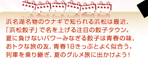 古くから「暴れ川」の異名を持つ天竜川を渡れば浜松はもうすぐ。静岡県内ナンバーワンの人口(約80万人)を誇る浜松市は、浜名湖の名産・ウナギで超有名。だが浜松は、いつのまにか日本有数の餃子タウンとしても名乗りを上げている。夏バテにはウナギも効果的ながら、庶民的な値段でパワーチャージできる餃子も魅力的。浜松の人々が愛してやまない「浜松餃子」の具材は野菜がメインだ。モヤシを中心に、花形に盛り付けた見た目も美しい。食欲全開の夏、できれば数店舗をハシゴして味わってみよう。