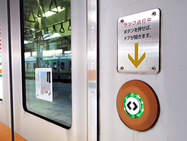 東京駅では昨年夏以来、冷房効果を高めるため、出発ホームに停車中の東海道線のドアは“セルフ開閉スタイル”に。ドア横のボタンを押して開閉する。閉める際は周囲にご注意を