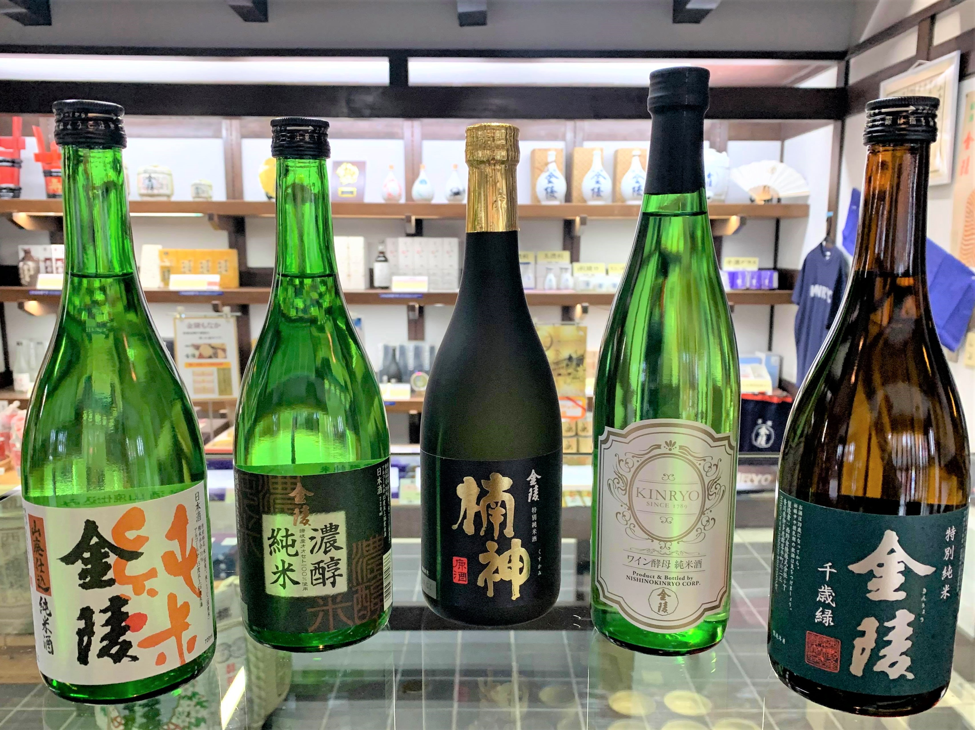 (左から)テーブル日本酒として料理と合わせたい「金陵 純米酒山廃仕込み」。蔵の定番人気商品「金陵 濃醇純米酒」、蔵でしか買えない「金陵 特別純米原酒 楠神」、日本酒に馴染みのない人にもオススメしたい甘酸っぱさが癖になる「金陵 ワイン酵母純米酒」、蔵限定販売の「金陵 千歳緑 純米酒」。試飲して気に入った一本を、家でも楽しんでみてはいかがでしょうか。