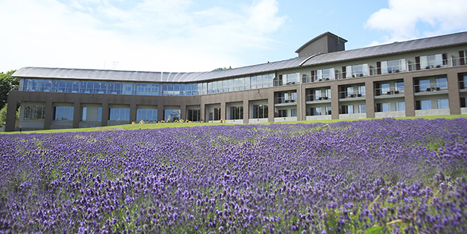 3万5000坪という敷地に設けられた客室は25室。すべての客室から眺められる庭、7月上旬には約5000株のラベンダーが咲き誇る。温泉は活火山でもある十勝岳の恵みの食塩泉。1泊2食23,625円~(平日2名利用時の1名料金)。