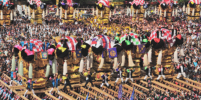 この時期の両県は祭り一色でもあります。神輿ではなく、豪華に飾りつけられた「太鼓台」と呼ばれるものを担ぐのが特徴。この太鼓の装飾が一台一台、趣向が凝らされ、みごとという他ありません。