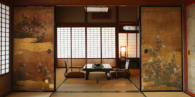 写真の「離れ 長生殿」は江戸期の襖絵などの調度品を愉しめる。今年の夏には坪庭を眺める半露天風呂が新たに完成。